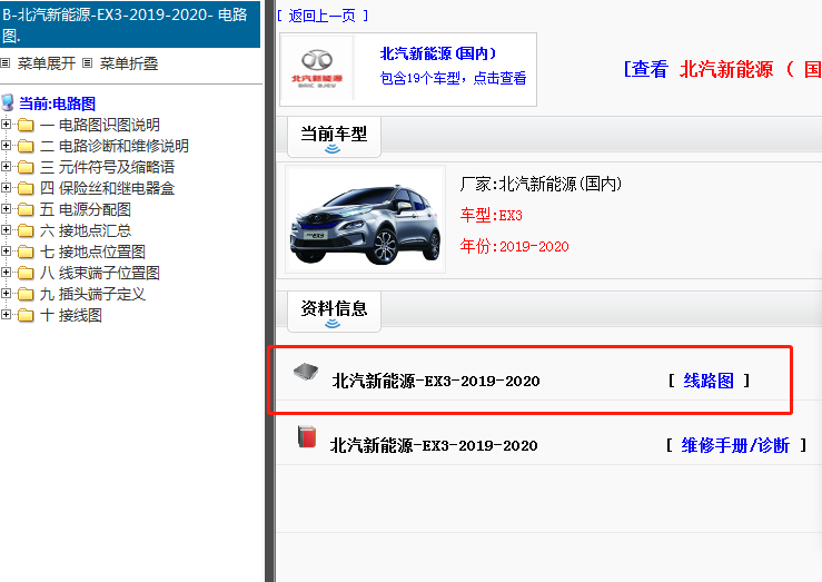 .尊敬的用户,欢迎您使用在线客服,您需要的资料已更新了全系统的电路图,请您直接进入畅易平台查询!查询方法:国内厂家 <-北汽新能源-EX3-2019-2020[ 线路图 ] .