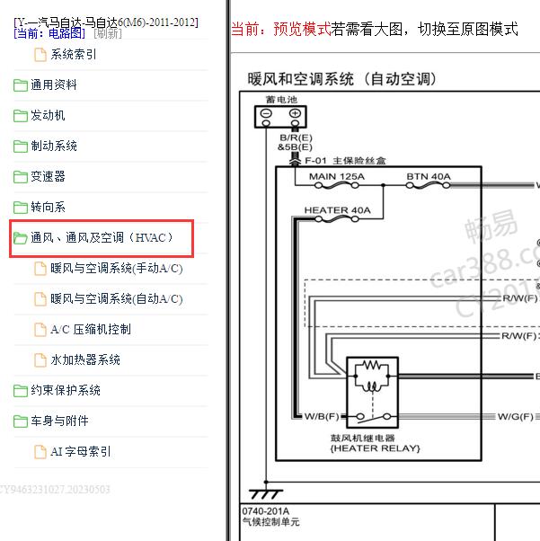 .尊敬的用户,欢迎你使用在线客服,你需要的资料在《畅易汽车维修技术支持平台》是有的,请直接登陆查询!查询方法:国内厂家 ->一汽马自达-马自达6(M6)-2011-2012[ 线路图 ] ->通风、通风及空调(HVAC) .