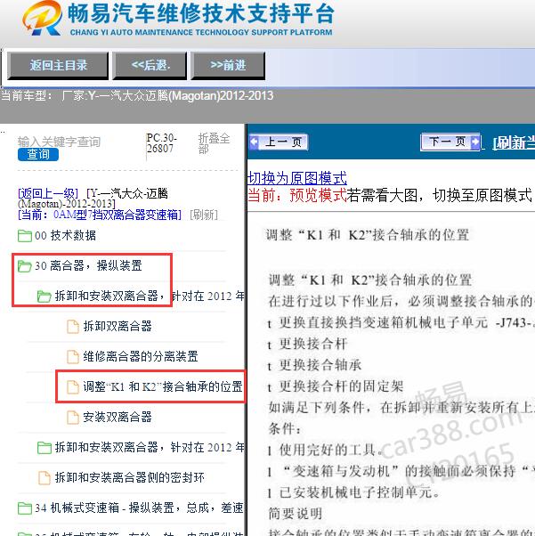 .尊敬的用户,欢迎你使用在线客服,你需要的资料在《畅易汽车维修技术支持平台》是有的,请直接登陆查询!查询方法:国内厂家 -> 一汽大众-迈腾(Magotan)-2012-2013[ 维修手册/诊断 ] - >1.传动系统 -> 0AM型7挡双离合器变速箱 -> 30 离合器,操纵装置 -> 拆卸和安装双离合器 -> 调整“K1”和“K2”接合轴承的位置 .