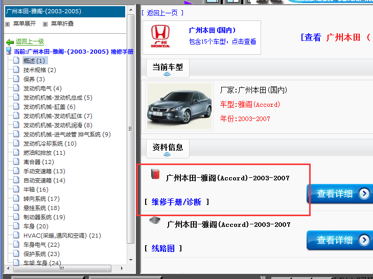 .尊敬的用户,欢迎你使用在线客服,你需要的资料在《畅易汽车维修技术支持平台》是有的,请直接登陆查询!查询方法:国内厂家 ->广州本田-雅阁(Accord)-2003-2007 ->维修手册/诊断。电路图在各个维修手册部分。.