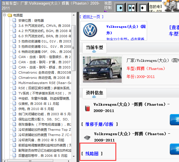 .尊敬的用户,欢迎你使用在线客服,你需要的资料在《畅易汽车维修技术支持平台》是有的,请直接登陆查询!查询方法:国内厂家 ->Volkswagen(大众)-辉腾(Phaeton)-2009-2011 ->[ 线路图 ] .