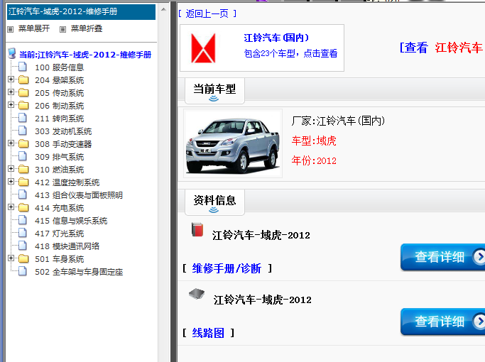 .尊敬的用户,欢迎您使用在线客服,您需要的资料已更新了全系统的维修资料,请直接登陆查询!查询方法:国内厂家 ->江铃汽车-域虎-2012 ->维修手册/诊断 .