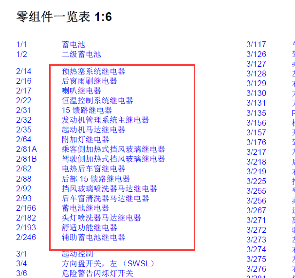 .您好,客服查看了该车的元件清单,该车资料里没有油泵继电器的资料,如图所示为全部的继电器说明。另外给您处理了全车的资料,请下载附件-打开链接-复制密码-下载资料,里面有您需要相关位置资料,如有疑问,欢迎和我们联系!【注:司机的车主使用手册里也带有保险丝和继电器的资料,您可以找司机要这本手册参考一下】.