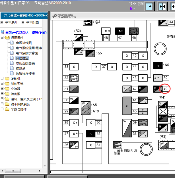 .尊敬的用户,欢迎你使用在线客服,你需要的资料在《畅易汽车维修技术支持平台》是有的,请直接登陆查询!查询方法:国内厂家->一汽马自达-M6-2009-2010[ 线路图 ]->通用资料->保险器盒.