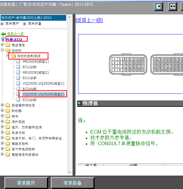 .尊敬的用户,欢迎你使用在线客服,你需要的资料在《畅易汽车维修技术支持平台》是有的,请直接登陆查询!查询方法:国内厂家 ->东风日产-天籁(Teana)-2011-2012 ->[ 维修手册/诊断 /电路图 ]->诊断->ECU ->发动机->发动机控制系统->VQ25DE,VQ35DE(类型2).